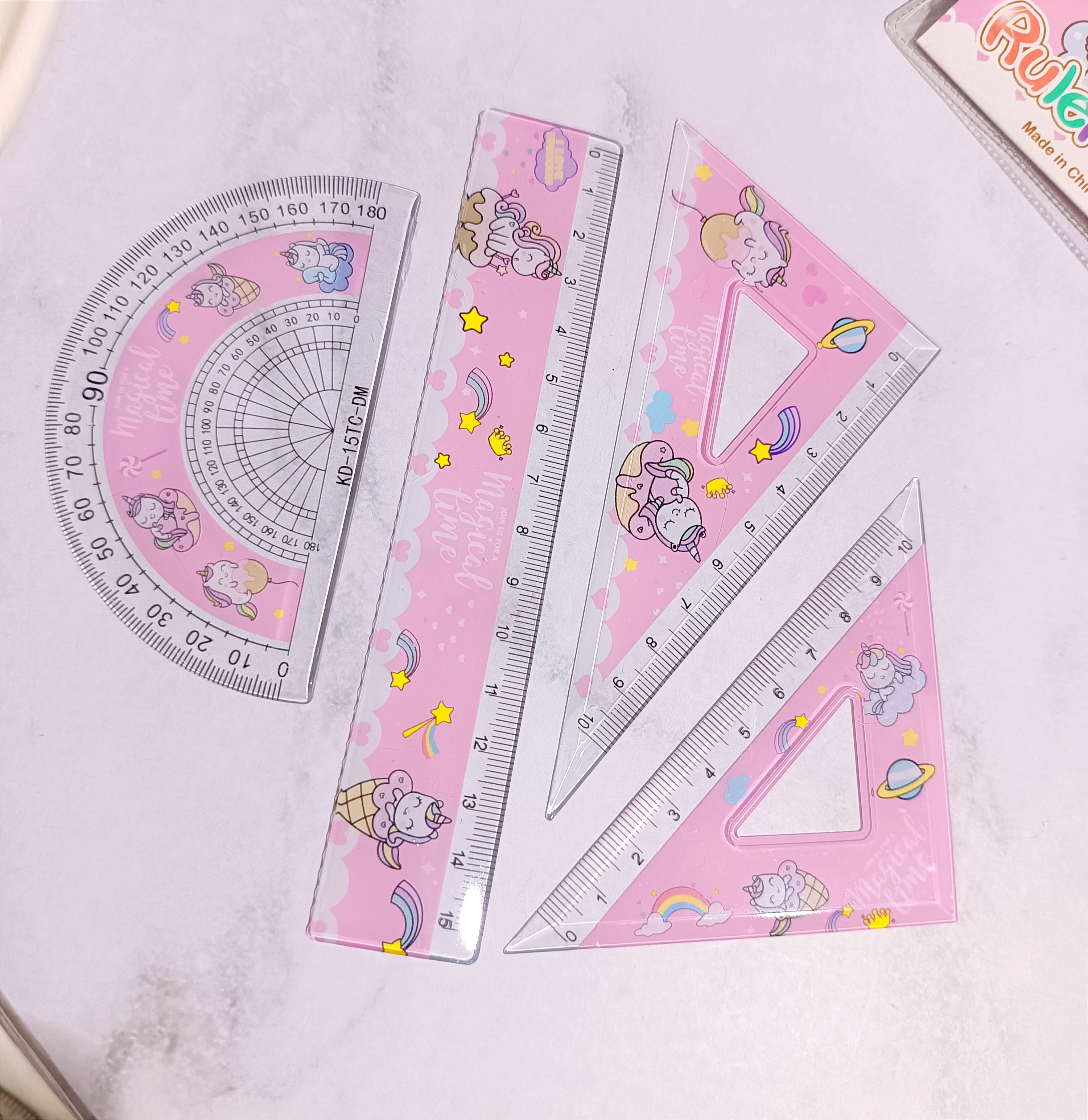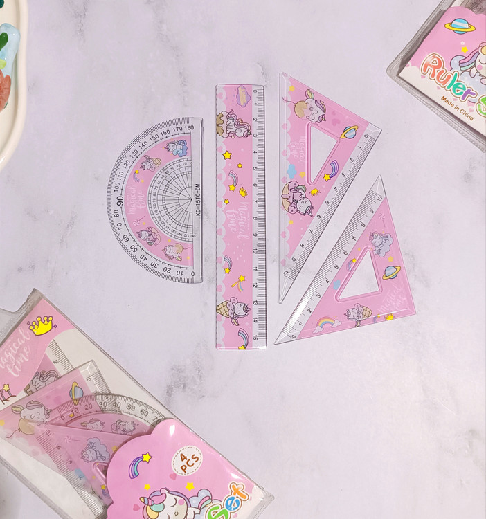 ست ۴ تیکه شفاف یونیکورن شامل یک نقاله ، یک خطکش ۱۵ سانتی متر ، یک گونیا ۴۵ درجه ، یک گونیا ۳۵ درجه میباشد . دارای یک کیف طلقی دکمه دار میباشد .