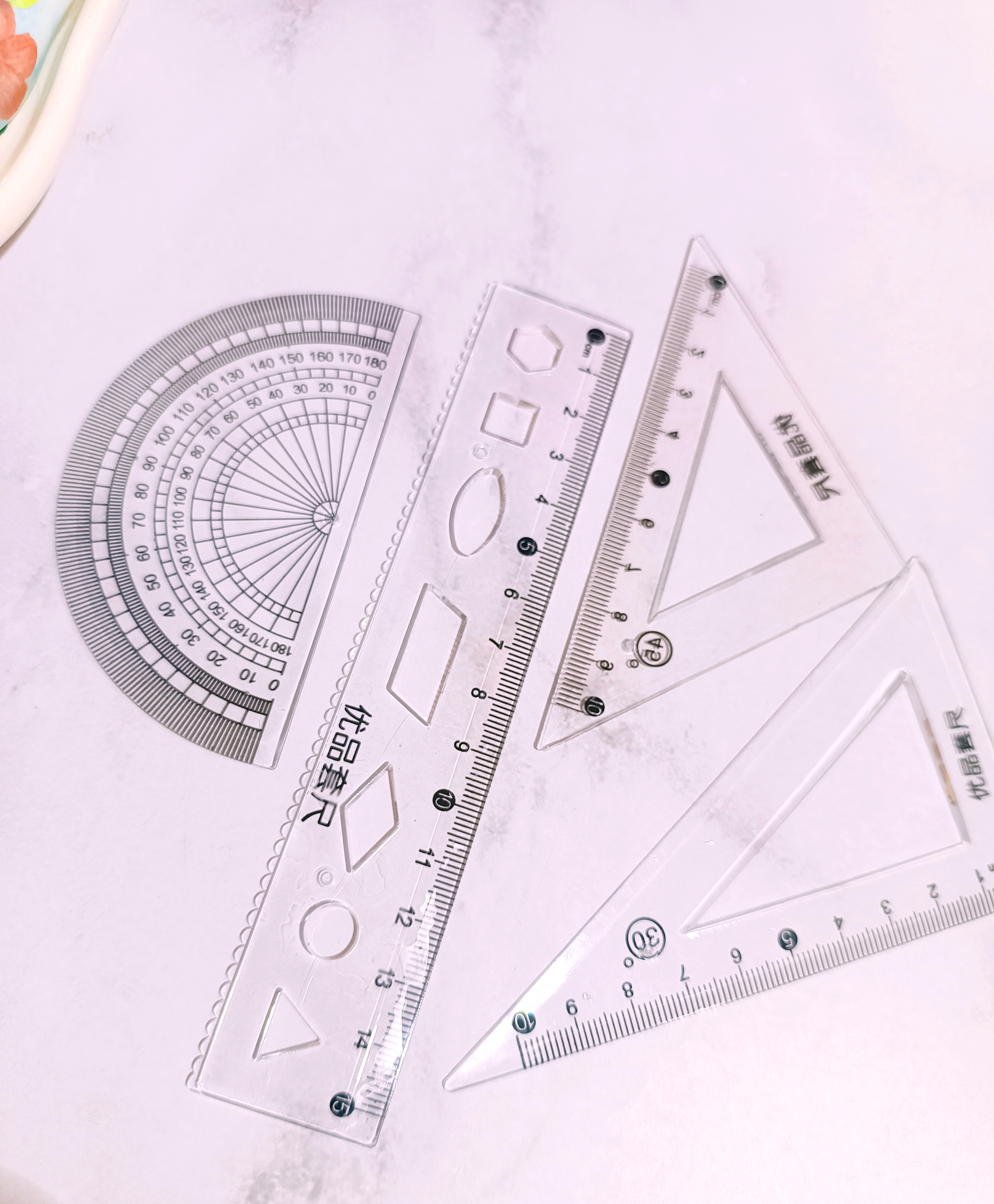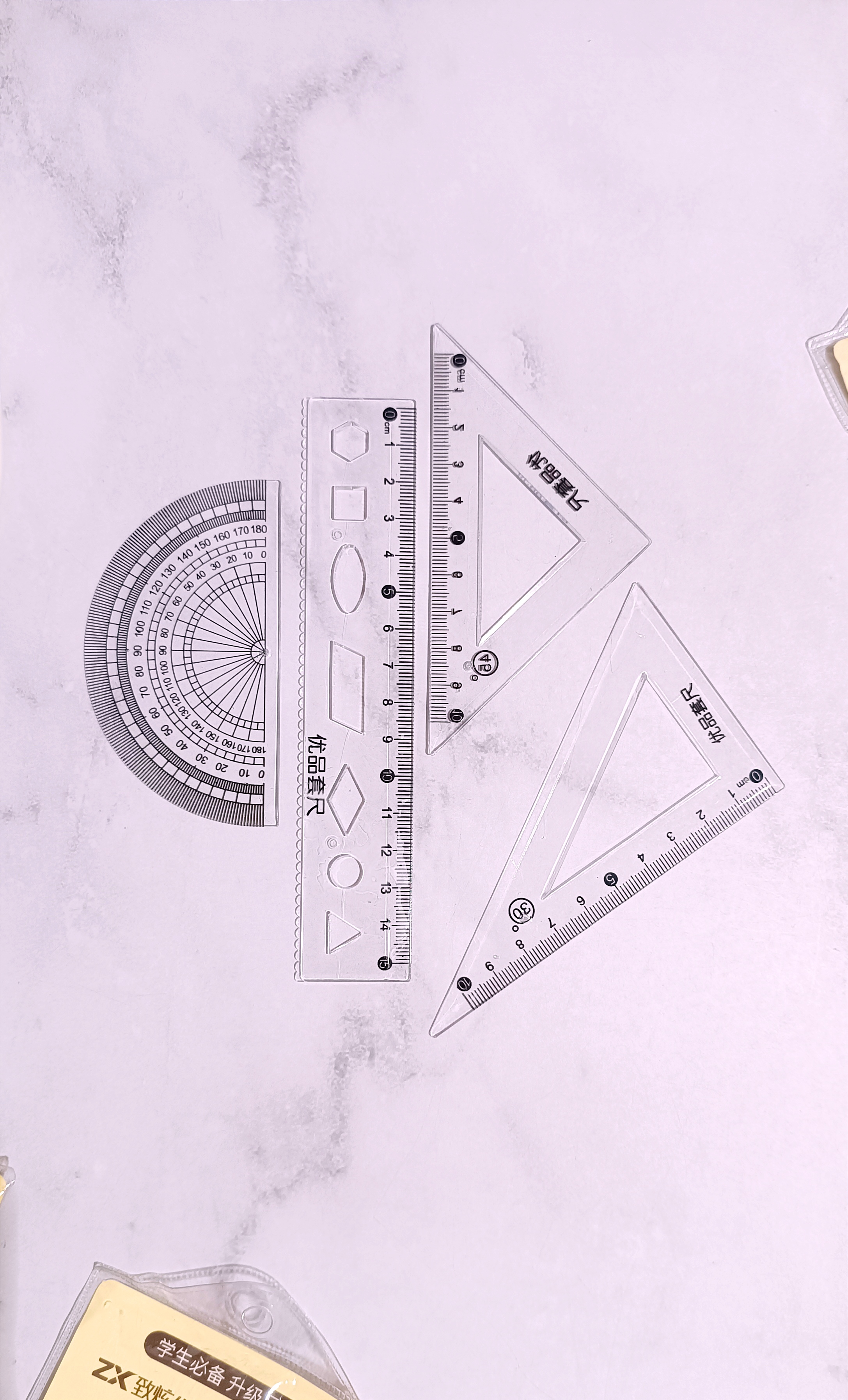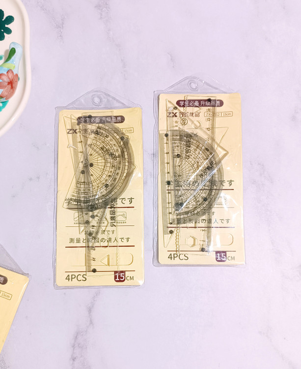 ست ۴ تیکه شفاف شیشه ای شامل نقاله ، گونیا ۴۵ درجه ، گونیا ۳۰ درجه و خطکش شابلون دار ۱۵ سانتی متری و یک کیف طلقی دکمه دار میباشد .