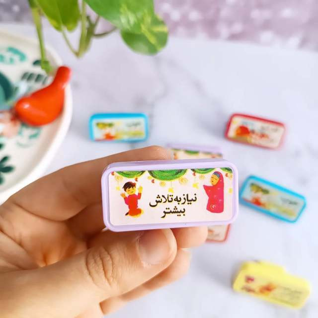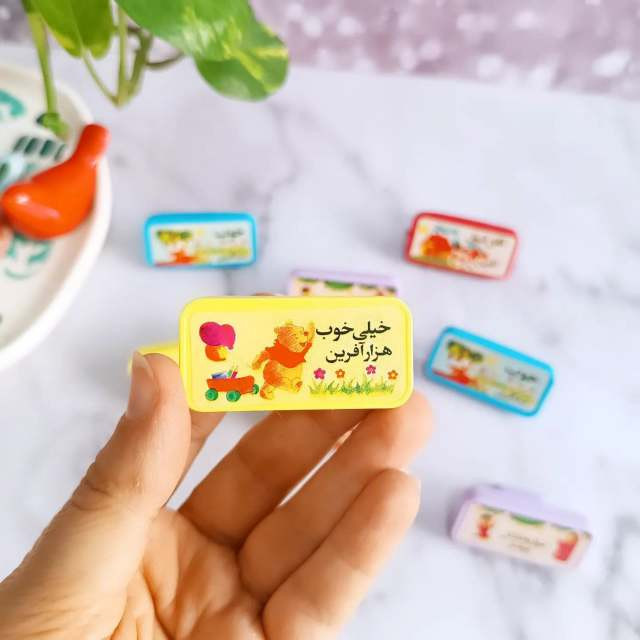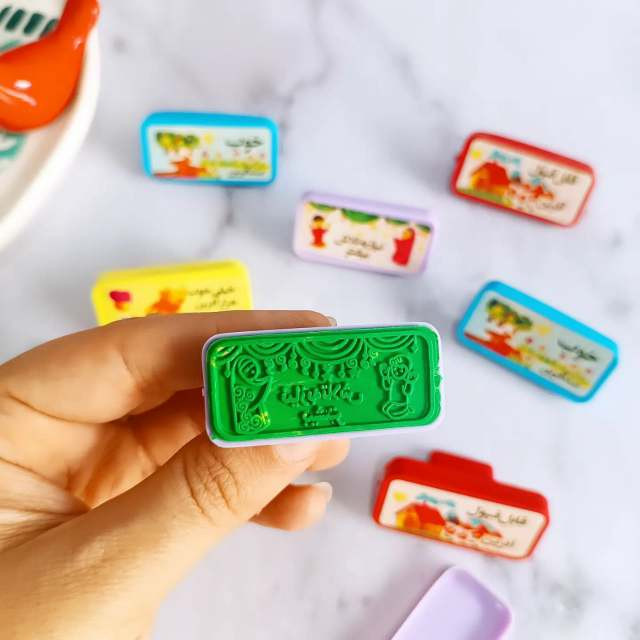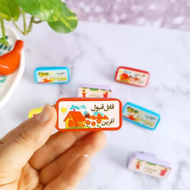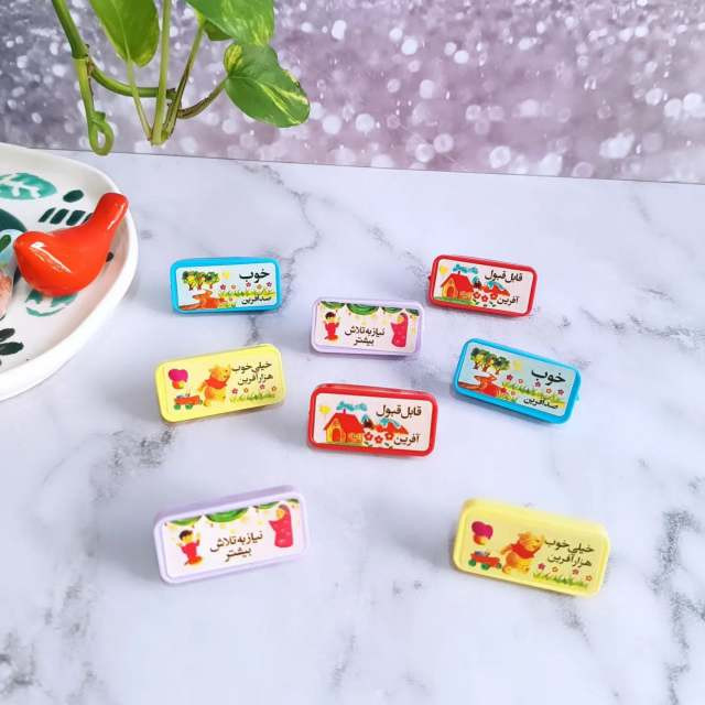 هر بسته شامل 4 عدد مهر با متن : خیلی خوب ، خوب ، نیاز به تلاش ، قابل قبول دارد .