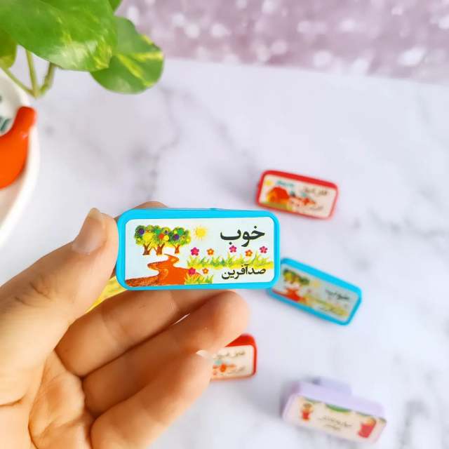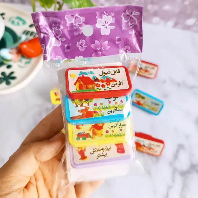 هر بسته شامل 4 عدد مهر با متن : خیلی خوب ، خوب ، نیاز به تلاش ، قابل قبول دارد .